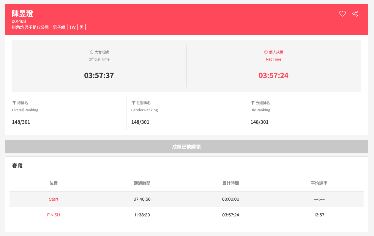 第一次參賽就挑戰 17k,只能說是初生之犢不畏虎。還跑進了分組前半的名次,已經大大超出我預期。備賽期間時常想起古明政說:「台灣山岳是我的訓練場 ,是訓練我心志、勇氣、技巧與謙卑的地方。」一部份的我似乎被這個過程永久的改變了。謝謝山馴服了我,我會繼續跑下去。